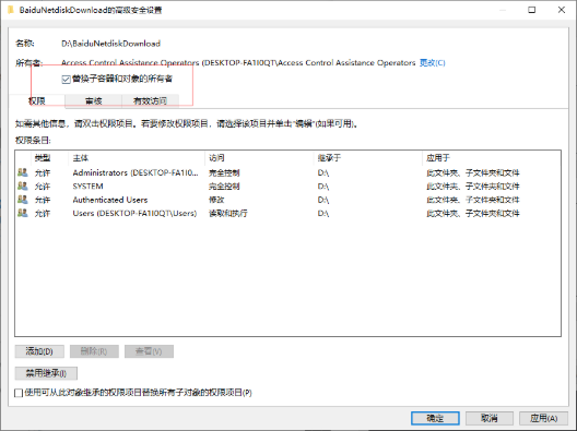 4、重新回到高级安全设置,勾选所有者下面的替换子容器和对象的所有者,再次点击确定。