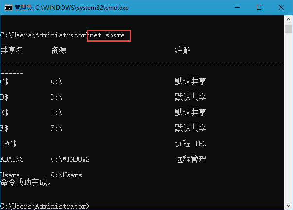 除此之外,Windows也会自带一些隐藏共享(以$为后缀的)。这个在视窗模式下是无法显示的,只有通过命令行方式查看它们。