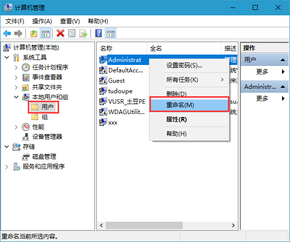 3、在右侧找到自己当前的用户名,单击右键,选择“重命名”,然后输入需要修改的用户名名称即可。