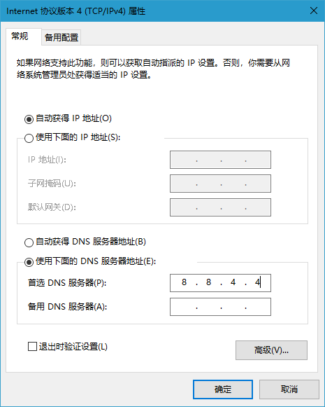 3、在属性窗口,将首选DNS服务器地址设置为“8.8.4.4”点击确定即可。