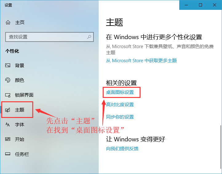 2、在打开的个性化设置中,我们先在左侧找到“主题”,然后相应在右侧找到“桌面图标设置”