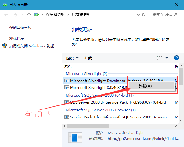 4、已安装更新路径,控制面板 - 所有控制面板项 - 程序和功能 - 已安装更新,然后在列表中找到有问题的更新,点击右键,卸载即可;