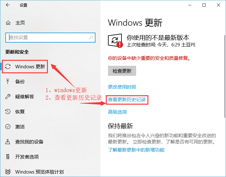 2、更新和安全窗口,先点击左侧的Windows 更新,然后点击右侧的查看更新历史记录(查看安装在你的设备上的更新);
