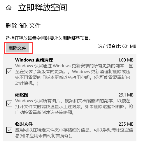 5、立即释放空间窗口,删除临时文件,选择在释放磁盘空间时要永久删除哪些项目。勾选需要删除的文件,基本上扫描的文件都可以将其删除,点击删除文件即可;