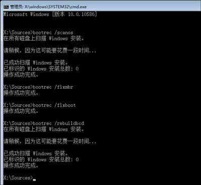 5、最后依次执行如下命令修复 Win10 的主引导记录并重建 BCD 配置文件: