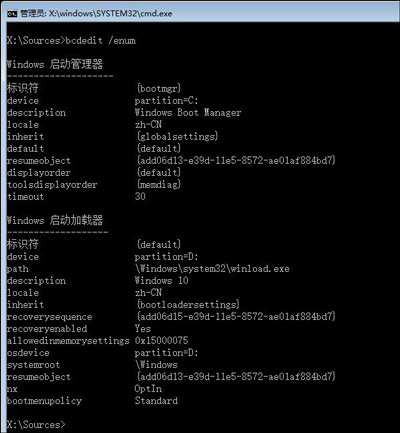 2、执行:bcdedit /enum 命令,如果看到如下图提示,说明引导记录已经损坏。