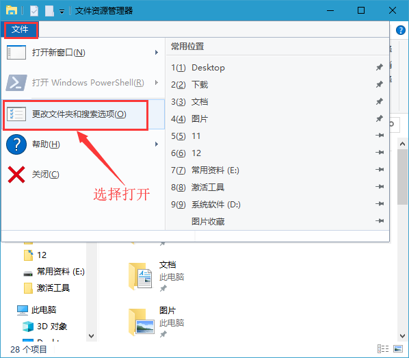 1、这时我们可以点击文件资源管理器左上角的“文件”菜单。