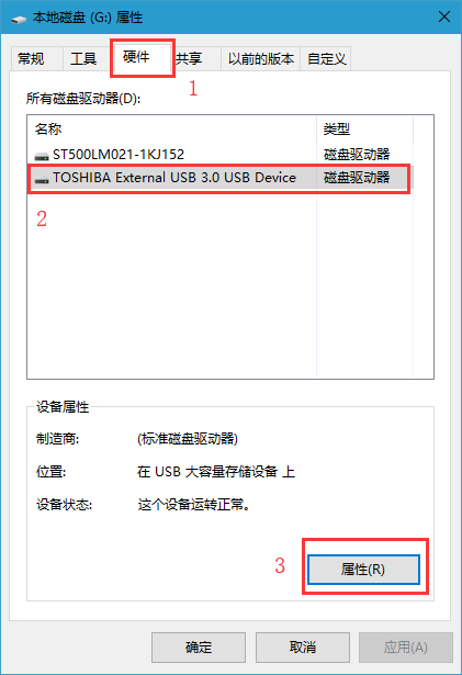1、首先,右键点击要加速的移动硬盘图标,选择“属性”,在打开页面中选择“硬件”标签。