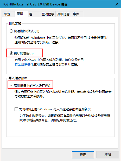 2、在打开的设置页面中,选择“更好的性能”,并且确认“写入缓存策略”部分的“启用设备上的写入缓存”选择框已经被选中,并且最好不要选择第二个选项,否则更容易在意外断电或拔出时出现数据丢失。
