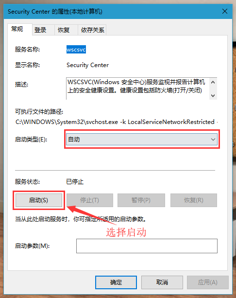 3、Security Center服务启动后,win10的这个问题就解决了;最后在此服务上右击鼠标,选择属性,在“Security Center的属性”窗口中将启动类型设置为“自动”,最后点击“确定”