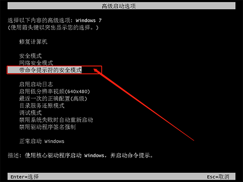 2、 使用上下方向键移动至“带命令提示符的安全模式”选项并回车