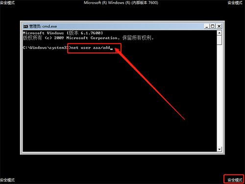 3、 随后,会出现安全模式下的“命令页面”,在页面中输入【net user aaa/add】并回车