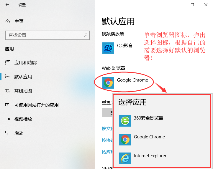 4、我们先选择“WEB浏览器”来修改,单击对应的浏览器图标,而后弹出选择应用窗口,我们在其中找到想要设置为默认浏览器的图标,并单击选择即可;