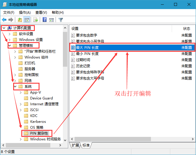 2、然后在本地组策略编辑器中,依次找到“计算机配置”-“管理模板”-“系统”-“PIN复杂性”,“最大PIN长度”,并双击打开进行编辑;
