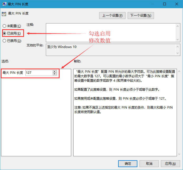 3、勾选“已启用”,并输入最大的PIN长度的数值“127”;并确定保存;