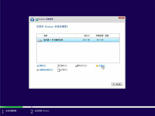 8、不需要重新分区的直接看第12步,进入到分区界面,如果之前有系统,要先备份好数据,然后删除所有分区,只剩下一个未分配的空间,选择未分配的空间,点击【新建】;