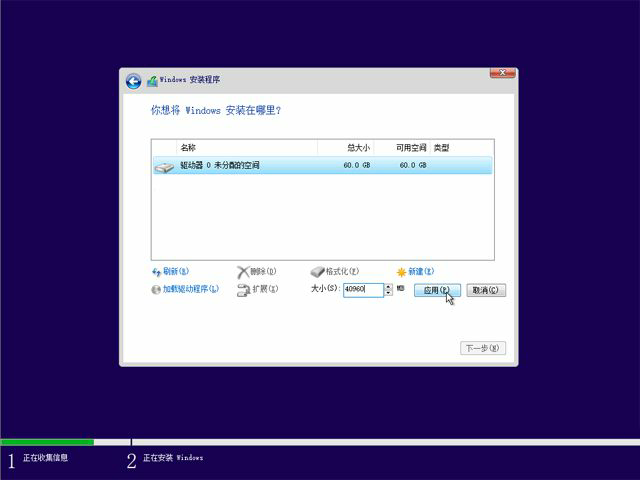 9、输入要建立的分区大小,如果固态硬盘容量小,大小直接默认,点击应用,建立一个分区,如果要2个以上分区,就自行设置大小,win10至少50G以上C盘空间,1G=1024MB,点击应用;