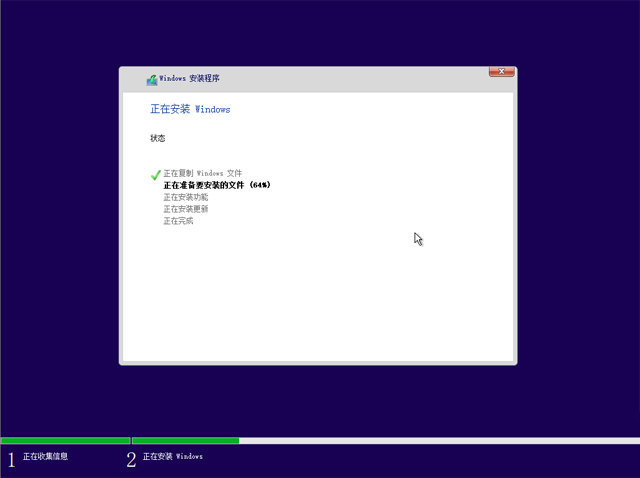 13、进入到这个界面,执行win10系统文件、功能安装过程,需等待几分钟;