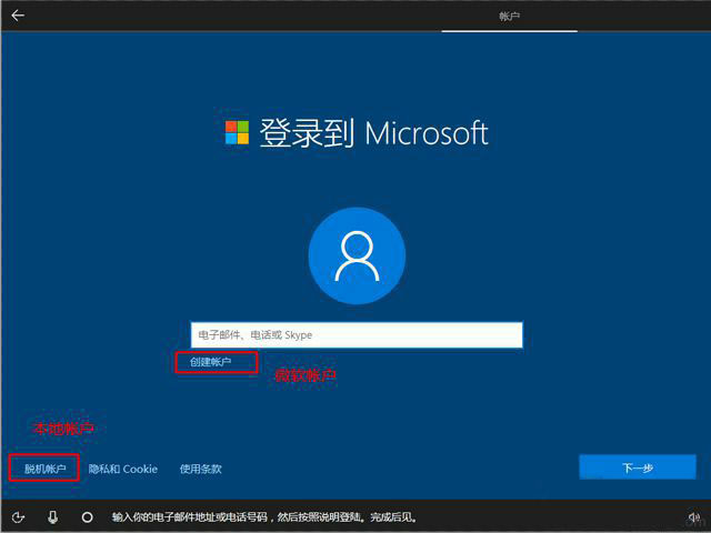 17、到创建帐户界面,【创建帐户】是建立微软Microsoft帐户,【脱机帐户】是建立本地帐户,这边选择建立脱机帐户;