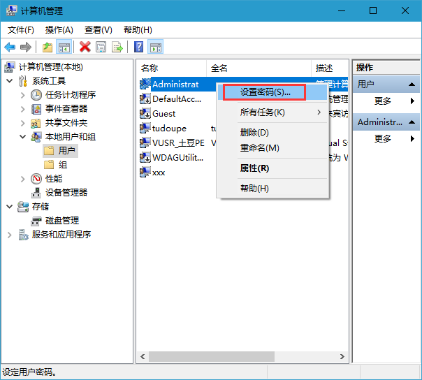 3、右键需要修改密码的用户,选择“设置密码”;如图所示: