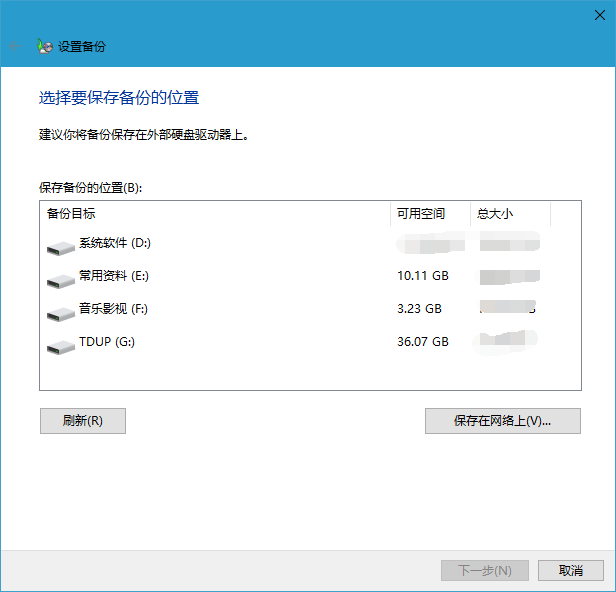 5、在打开该界面的同时会首先弹出一个“正在查找备份设备”扫描窗口,等待扫描完毕,选择备份的系统映像的保存位置,可以是在硬盘上,也可以是在DVD光盘上或网络位置上。一般情况下我们都保存在硬盘上,保存位置的硬盘分区需要是NTFS格式化。如果你有大容量的移动硬盘,在刚才点击“系统映像备份”之前先插上,然后在这里就可以把保存备份的位置选择移动硬盘。而且系统也建议把系统映像备份到另一物理磁盘,例如移动硬盘或U盘上。选择好保存位置,然后点击“下一步”,就会显示“你要在备份中包括哪些驱动器”界面。如图: