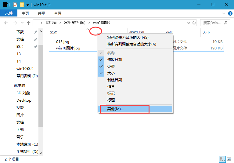 2、在“名称”、“日期”、“类型”、“大小”或“标记”任意一栏上单击鼠标右键,选择“其他”;