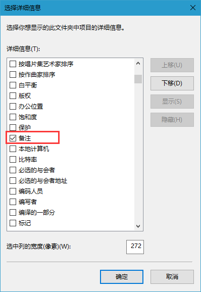 3、在详细信息框中找到“备注”并将其勾选起来,点击“确定”就可以了。