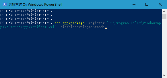 add-appxpackage -register "C:\Program Files\WindowsApps\*Store*\AppxManifest.xml" -disabledevelopmentmode