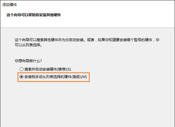 4、选择第二个选项“安装我手动从列表选择的硬件(高级)(M)”,点击下一步。