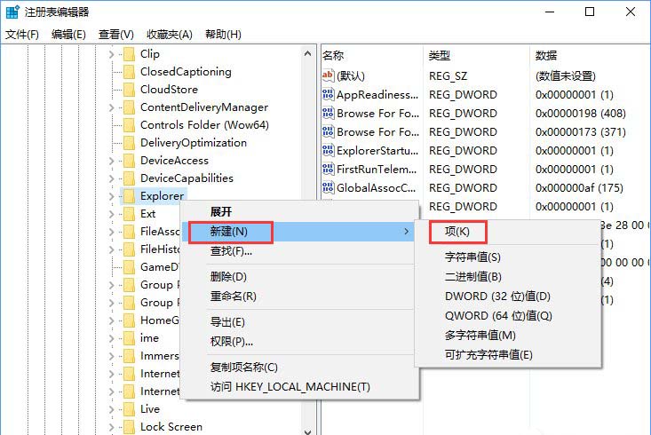 2、在左侧依次展开HKEY_CURRENT_USER \ SOFTWARE \ Microsoft \ Windows \ CurrentVersion \ Explorer,右键选择【新建】-【项】,将该名称命名为MultitaskingView;