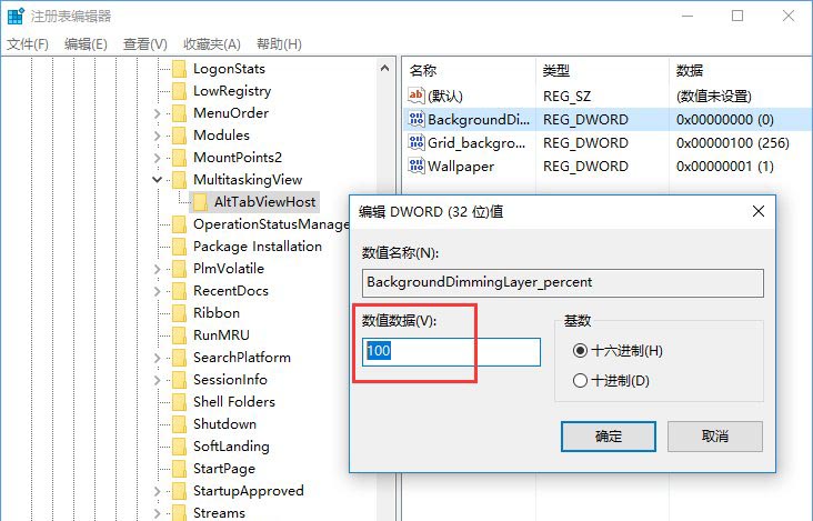 6、在AltTabViewHost上单击右键,然后选择新建-Dword(32位)值,将其命名为BackgroundDimmingLayer_percent,以百分比设置值,100%为完全调光。