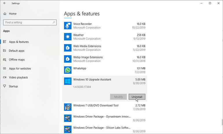 2、Windows10Upgrade是更易于删除的文件夹,因此让我们首先解决这个问题。 打开设置,然后转到应用类别。 在“应用程序和功能”屏幕上,向下滚动,直到看到Windows 10 Update Assistant的条目。 单击它,然后单击“卸载”按钮(图B)。 在下一个屏幕上,选择“卸载”按钮,确认要卸载Windows 10 Update Assistant。