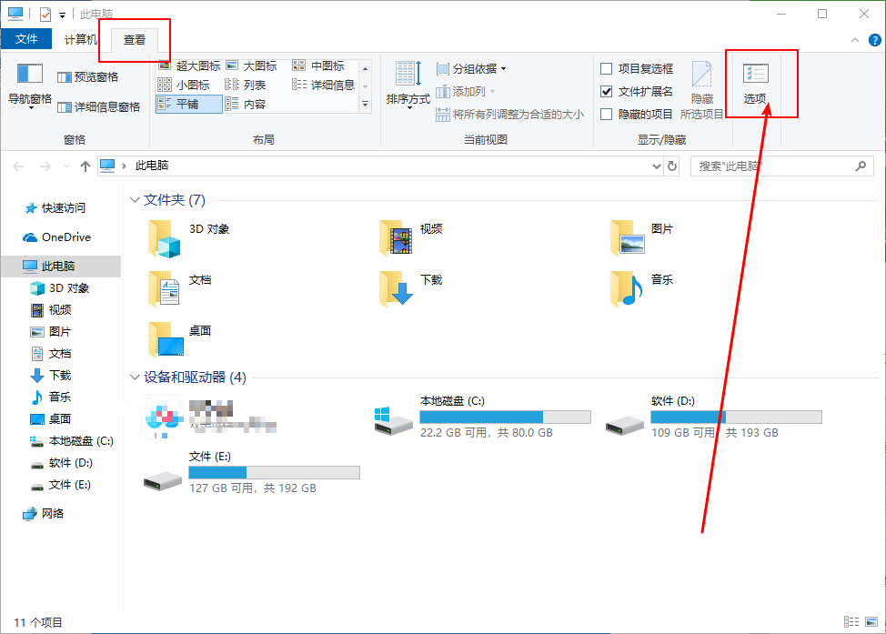 1、 首先在文件夹选项中开启隐藏文件的显示功能:双击进入“此电脑”,在文件资源管理器中点击“查看”标签,然后点击右侧的“选项”按钮