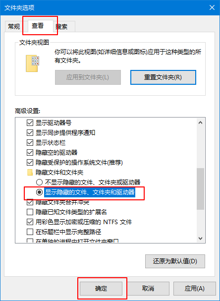 2、 进入“文件夹选项”后,再点击 “查看”标签,在下面选择“显示隐藏的文件、文件夹和驱动器”,点击确定即可。