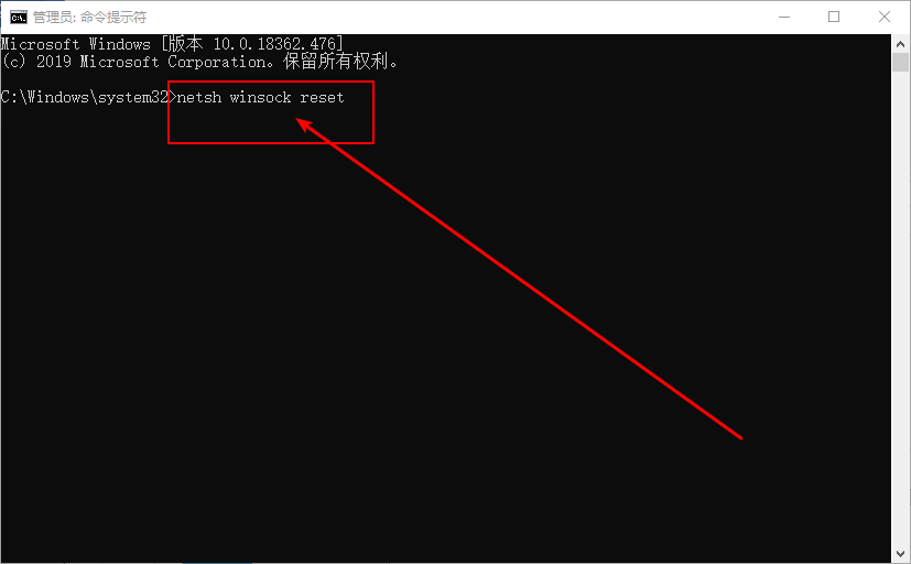 2、在窗口中输入:输入 netsh winsock reset 然后按下回车键;