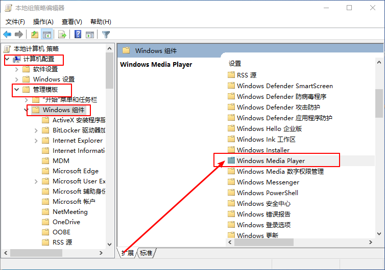 2、在“本地组策略编辑器”窗口中,依次展开“计算机配置--》管理模版--》Windows组件”命令选项,在右侧窗格中找到“Windows Media Player”选项,选中并双击打开;