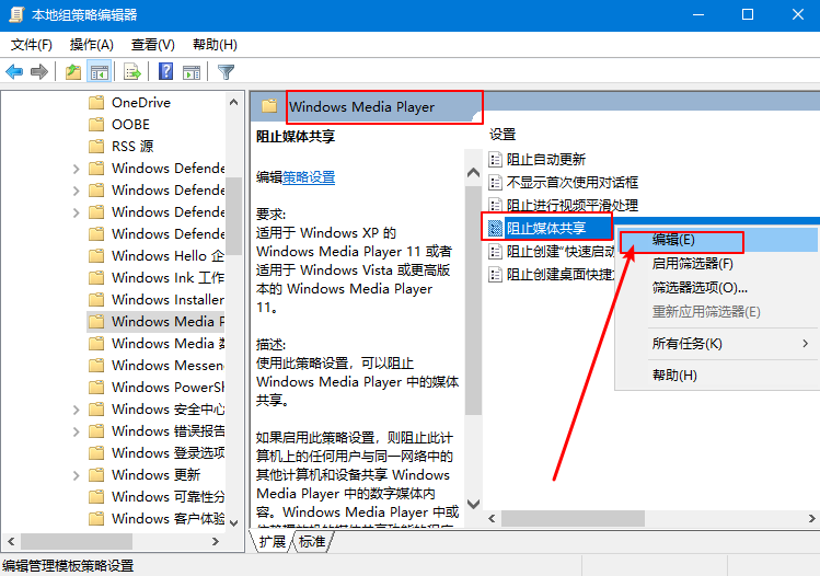 3、在“Windows Media Player”选项右侧窗格中找到“阻止媒体共享”,右键点击“阻止媒体共享”打开“编辑”选项命令;