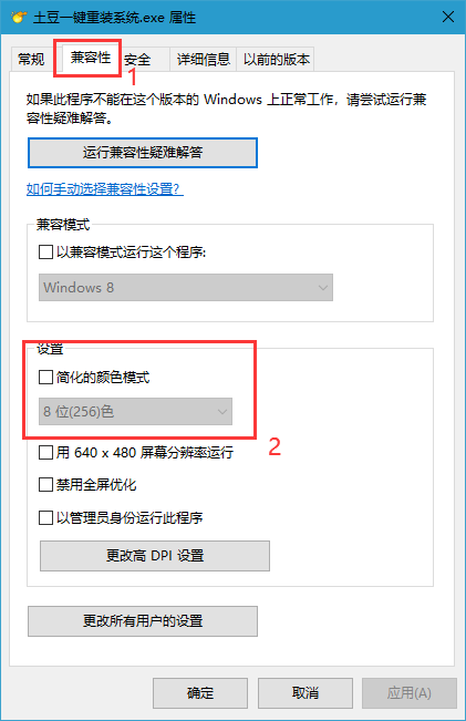 2、切换到“兼容性”选项卡,在下面勾选“简化的颜色模式”,在下拉菜单中选择“8位(256色)” 然后点击应用并确定即可;如图所示:
