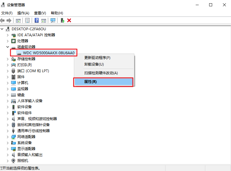 2、在设备管理器窗口,点开磁盘驱动器项目,然后对着电脑硬盘单击鼠标右键,点击选择菜单中的“属性”。