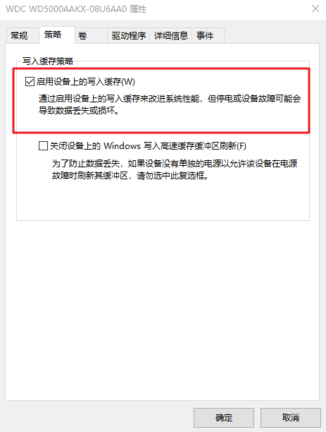 注意:勾选“启用此设备上的写入缓存”是启用该功能,取消勾选是关闭。