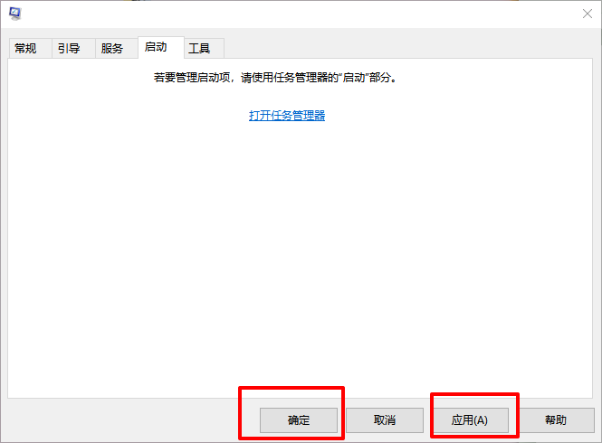 4、然后,切换到“启动”,点击“打开任务管理器”,禁用所有启动项