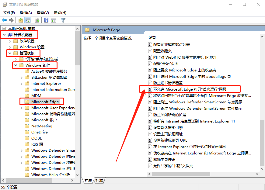 2、在本地组策略编辑器窗口左侧,依次展开:【计算机配置-管理模板-Windows组件-Microsoft Edge】,在窗口右侧找到并双击打开【不允许Microsoft Edge打开“首次运行”网页】