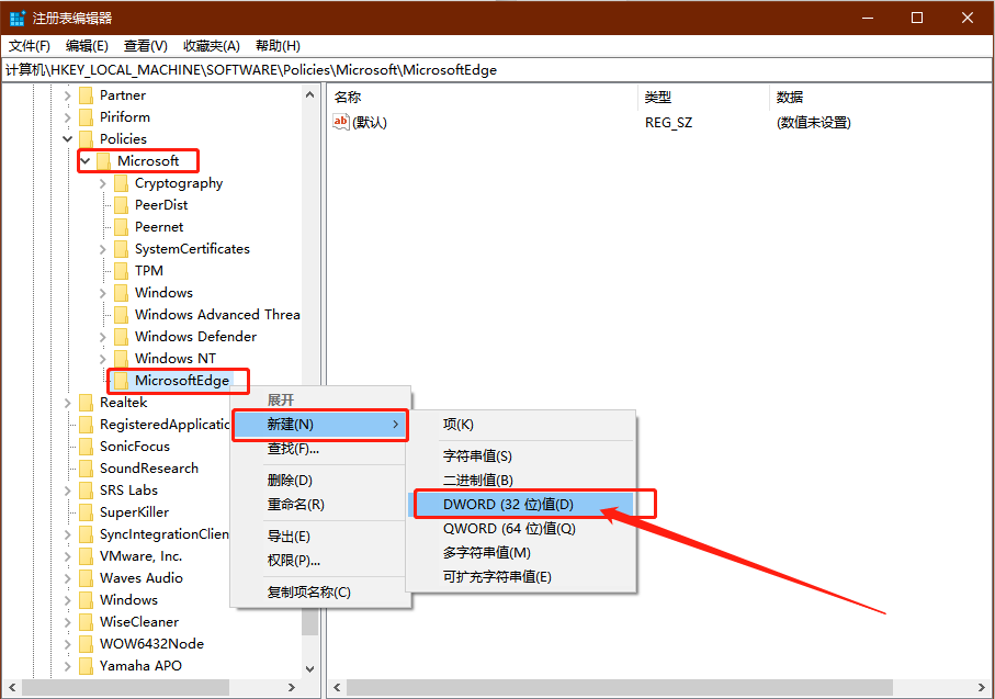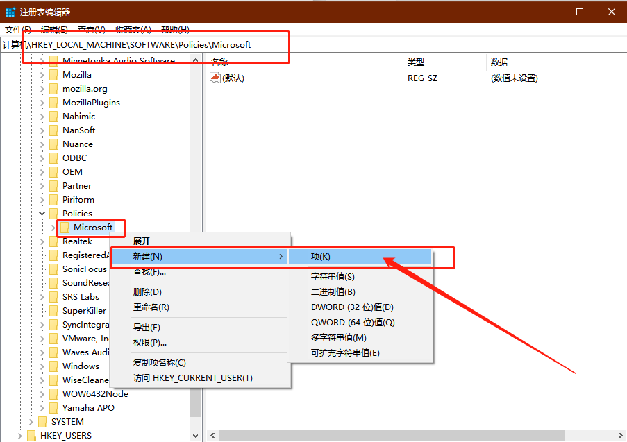 2、在注册表编辑器窗口中,依次展开:【HKEY_LOCAL_MACHINE\SOFTWARE\Policies\Microsoft】,并右键Microsoft项,选择【新建-项】,命名为【MicrosoftEdge】;