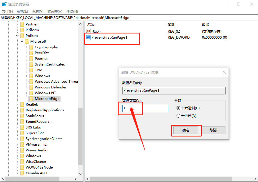 4、最后,双击PreventFirstRunPage值,将其数值数据从0改为【1】,点击“确定”保存即可。