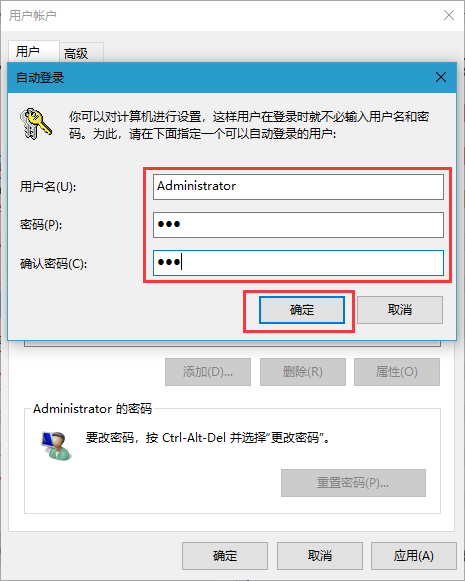 3、点击去掉时会弹出自动登录对话框验证权限,输入用户名和密码点击确定,下次开机登录时就不需要密码了。