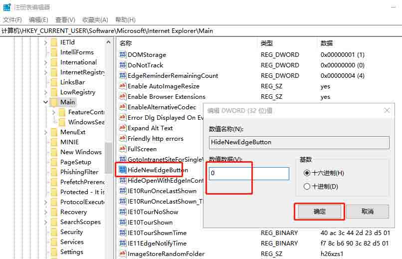 3、在右侧页面,找到并双击【HideNewEdgeButton】的DWORD(32位)值,把它的数值数据设置为【0】,然后点击【确定】即可