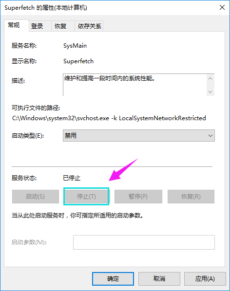 5、“superfecth”的属性窗口,选择【禁用】并点击【停止】,点击确定。