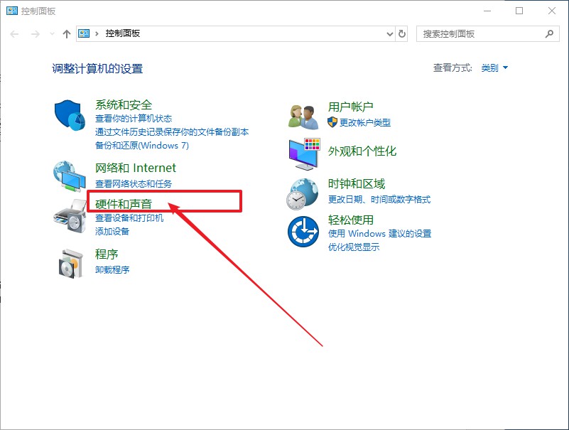 2、 然后,打开控制面板中的“硬件和声音”选项。