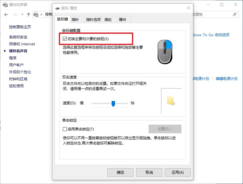 4、 在鼠标属性设置的按键设置中勾选“切换主要和次要的按钮”,点击确定即可。