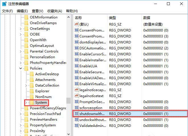 4、 在右侧页面,找到并双击【shutdownwithoutlogon】,将数据设置为【0】即可